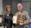 Distrikt-Governorin Dr. Bettina Wolf (links) überreichte dem Hochheimer Sascha Koenig (rechts) mit dem Melvin-Jones-Fellowship-Award die höchste Auszeichnung, welche die weltweite Lions-Organisation zu vergeben hat. Während die Anstecknadel eher unscheinbar wirkt, ist die zugehörige Holztafel umso imposanter.