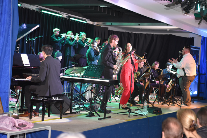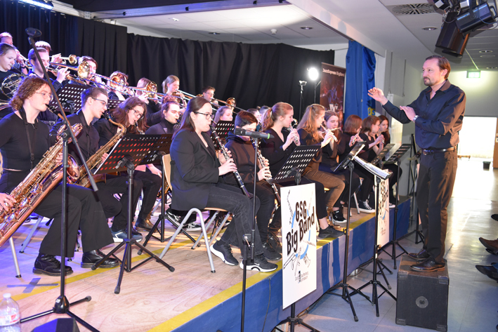 Mit „Blues for a new Day“ wurde der Konzertabend eröffnet – einem zeitgenössischen Werk des international anerkannter Jazzkünstlers und Jazzpädagogen Mike Steinel, das nahtlos an traditionelle Jazzwerke im Bigband-Sound anknüpft. Verstärkt um die von Dominik Plachta angeleitete Rhythmusgruppe folgte „Tequila“, ein weithin bekanntes Stück, bei dem das Publikum sich bereits eifrig an den vokalen Einwürfen beteiligte. Das Percussion-lastige „Samba de Janeiro“ bildete den Abschluss des Vorprogramms, welches der erste Auftritt des Jahres 2023 für die Schüler-Bigband des Graf-Stauffenberg-Gymnasiums unter der Leitung von Bernhard Frank war.