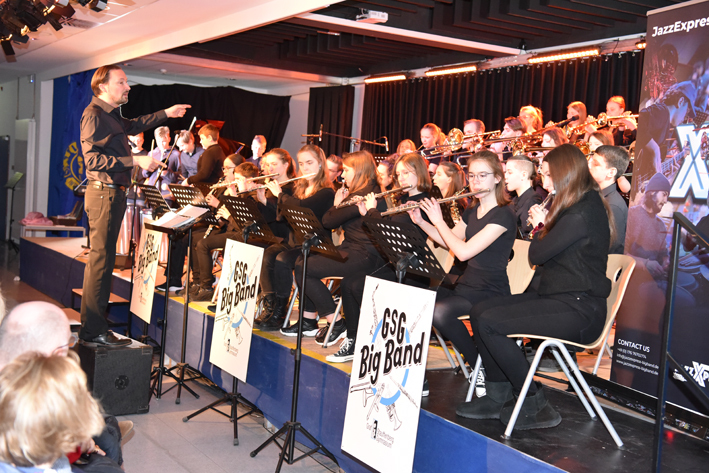 Den Auftakt des Konzerts bildete die Schüler-Bigband des Graf-Stauffenberg-Gymnasiums – eine Combo, in der seinerzeit auch der heutige Jazz-Express-Bandleader Jonas Kießling die Trompete spielte. „Wir haben gemeinsam am Graf-Stauffenberg-Gymnasium begonnen“, wusste der die Schüler-Bigband leitende Musiklehrer Bernhard Frank dem Publikum ergänzend zu berichten, um augenzwinkernd „ich als Lehrer, er als Fünftklässler“ hinzuzufügen.